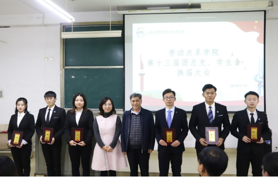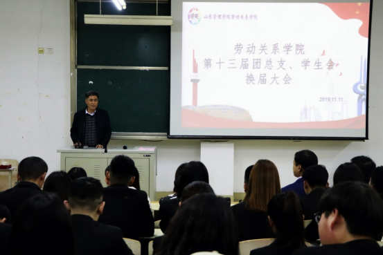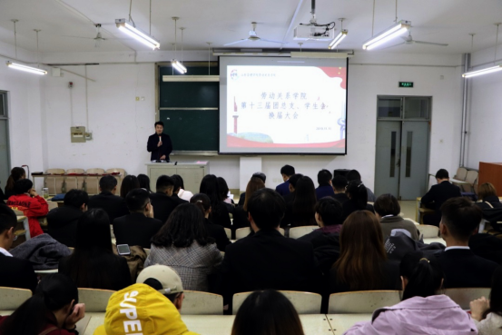 2019年11月11日晚,劳动关系学院在博学楼C204教室举行团总支、学生会换届大会。劳动关系学院党总支书记姜学波、院长耿艳丽、党总支副书记苏康、学工办主任王奎、及各班辅导员、班主任出席,第十二届团总支、学生会成员代表,第十三届团总支、学生会全体学生干部,17级本科、18级、19级各班主要学生干部参加会议。换届大会由学工办主任王奎老师主持。