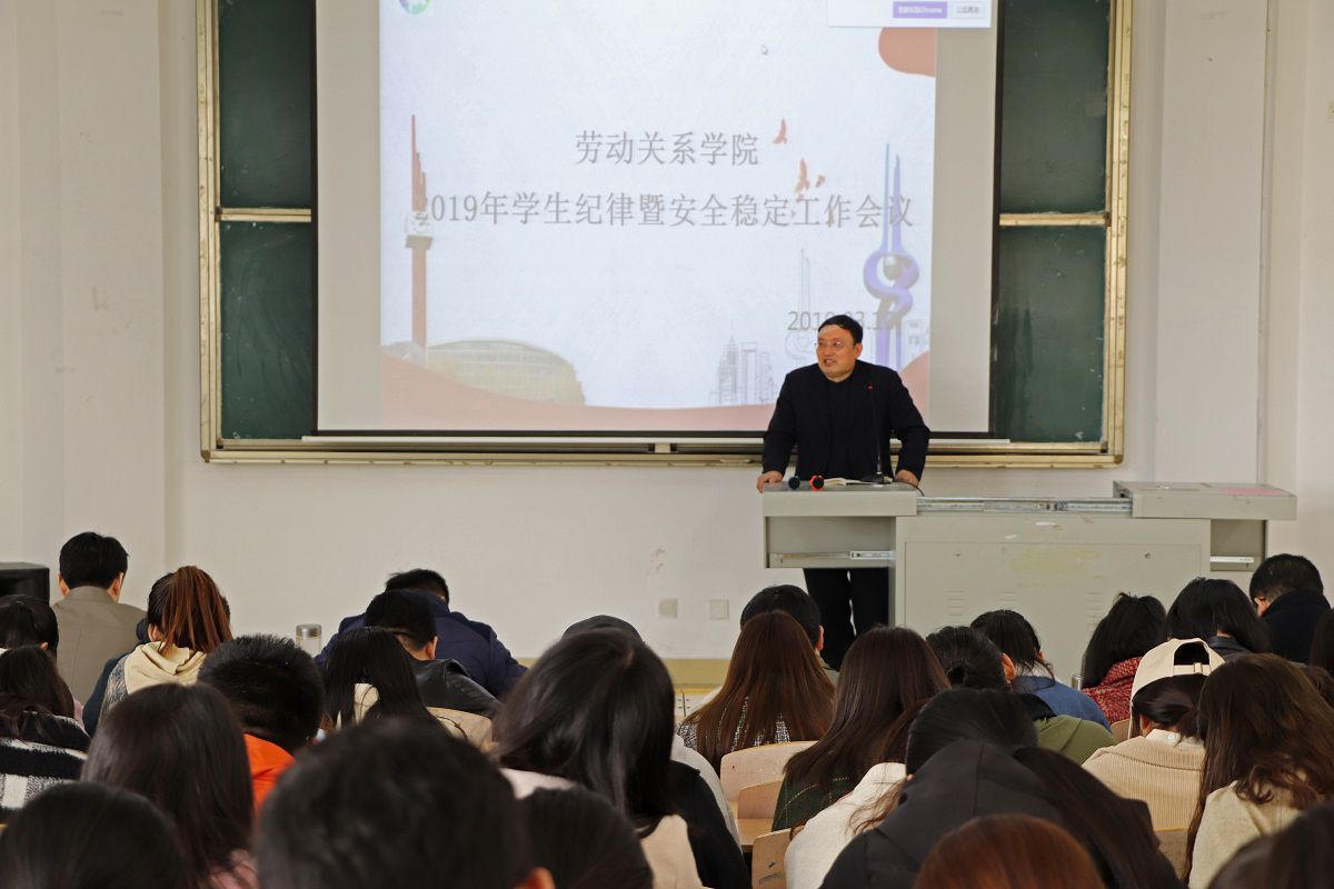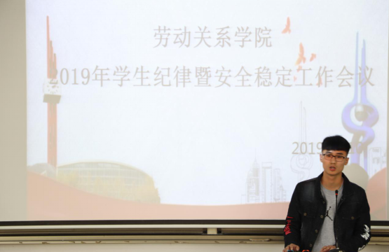 2019年3月10日上午,劳动关系学院在博学楼B204教室召开学生纪律暨安全稳定工作会议。劳动关系学院党总支书记孙家学、党总支副书记苏康、学工办主任王奎、学工办副主任孙亮及各班辅导员、班主任出席,第十二届团总支、学生会全体成员、各班学生干部、宿舍长参加会议。会议由党总支苏康主持。