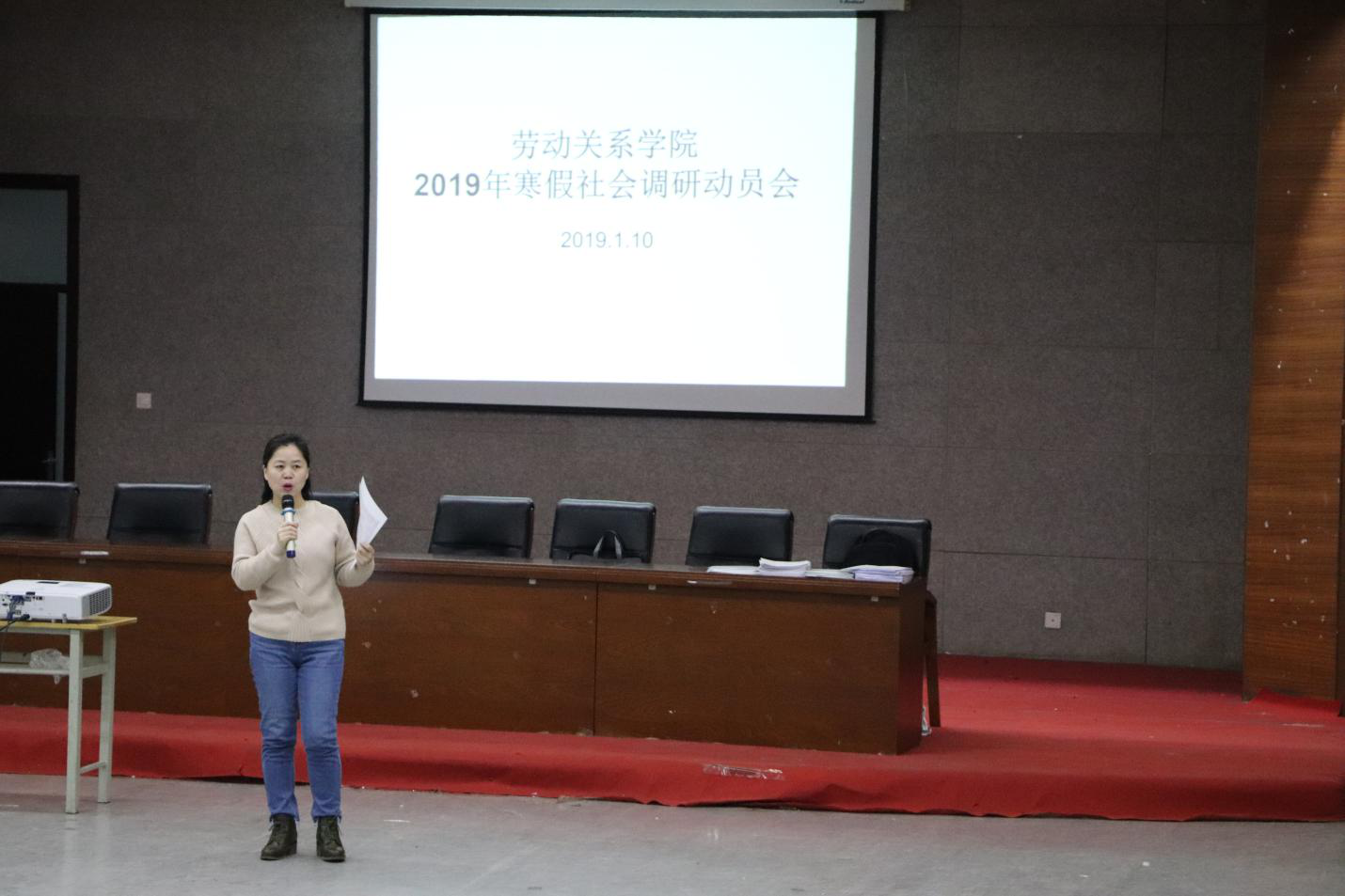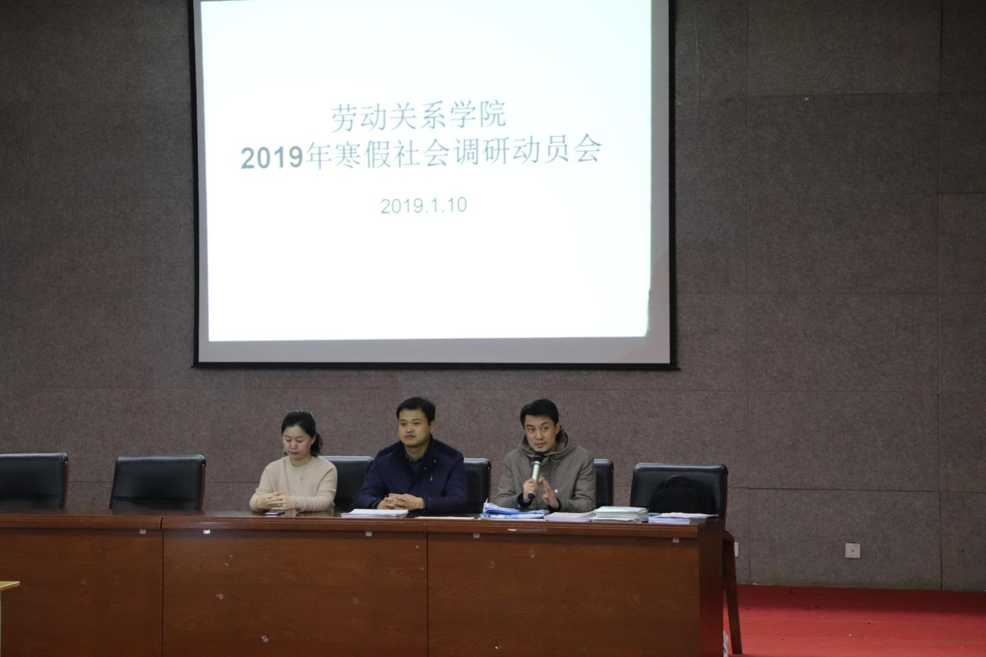 2019年1月10日下午,我院在图书馆报告厅举行寒假社会调研动员大会。劳动关系学院党总支副书记苏康出席活动,参加人员包括学工办主任王奎、人力资源管理教研室主任张会荣及班主任郭若川、周洋和2016级本科班及2017级、2018级全体同学。动员大会由王奎主持。