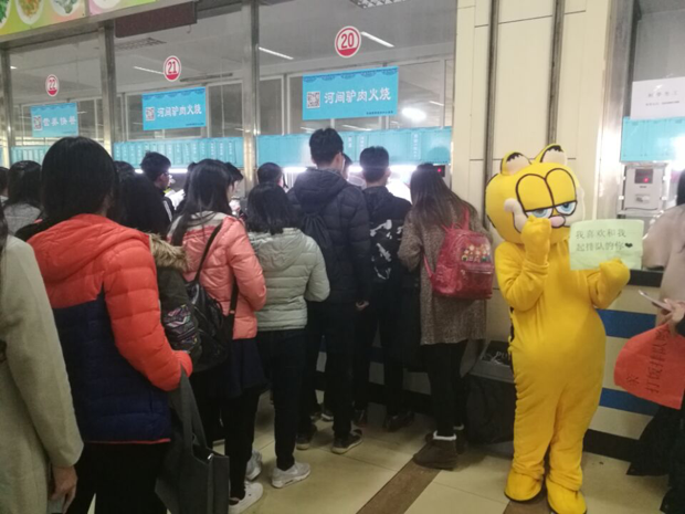 活动当天,该专业学生不仅利用夺人眼球的玩偶手举就餐排队倡议牌,还身着正装去排队买饭。此种率先垂范、身体力行的排队行为,吸引了绝大多数同学的注意,自觉的加入到队列中来,赢得了同学们以及餐厅工作人员的赞誉。在采访过程中,发现由于餐厅的购买区与就餐区间隙有限,所以一度出现了因队伍过长而妨碍同学过往的情形。但是,此次活动倡导的者公共关系专业师生表示,万事开头难,他们会听取各方意见,根据实际情况做出相应调整,努力让此次活动达到预期效果。