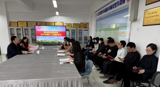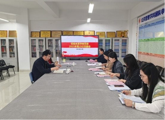 学院党委会议深入贯彻落实“第一议题”制度,学习研讨二十届四中全会精神要点。党委书记李丽娜汇报了学院前期学习情况,党委成员结合分管工作,就如何将全会精神融入学科建设、教学改革、社会服务等重点工作进行交流发言。随后,会议研究通过了关于2025年度劳动关系学院工作总结的政治审查、拟引进人才的政治审查等会议议题。